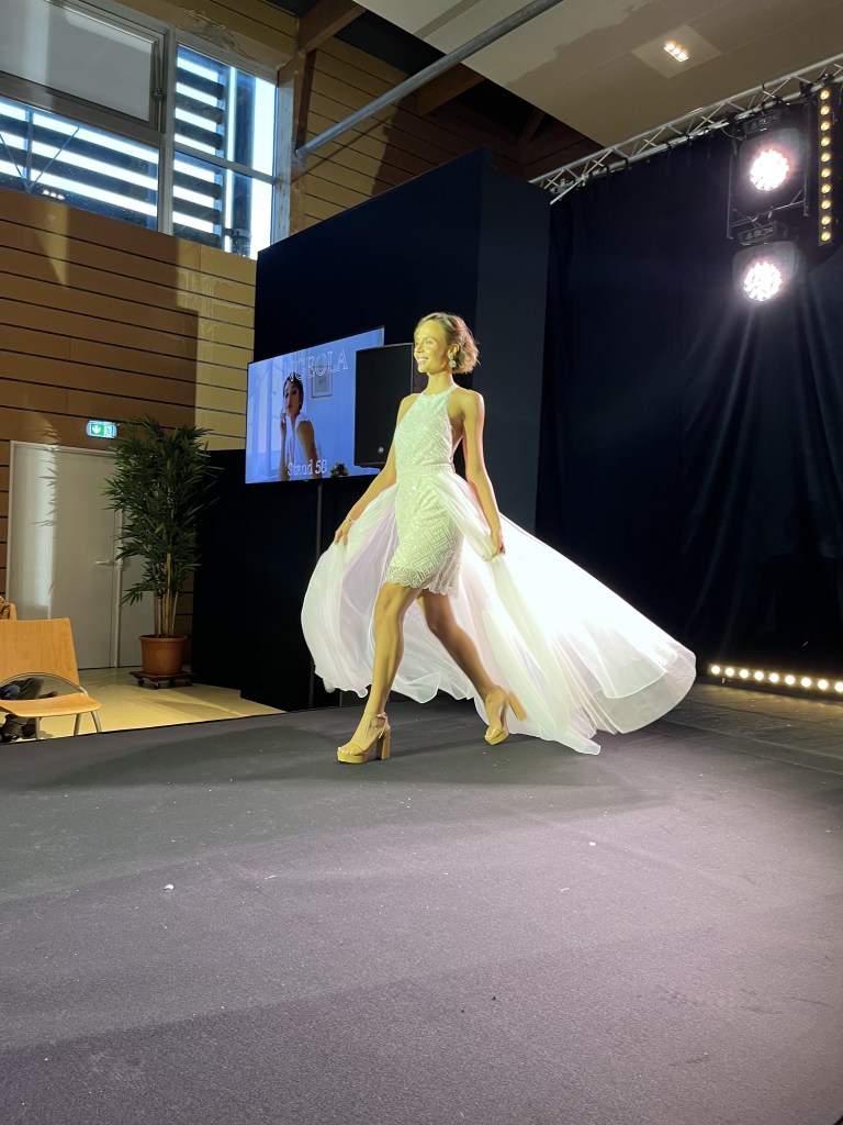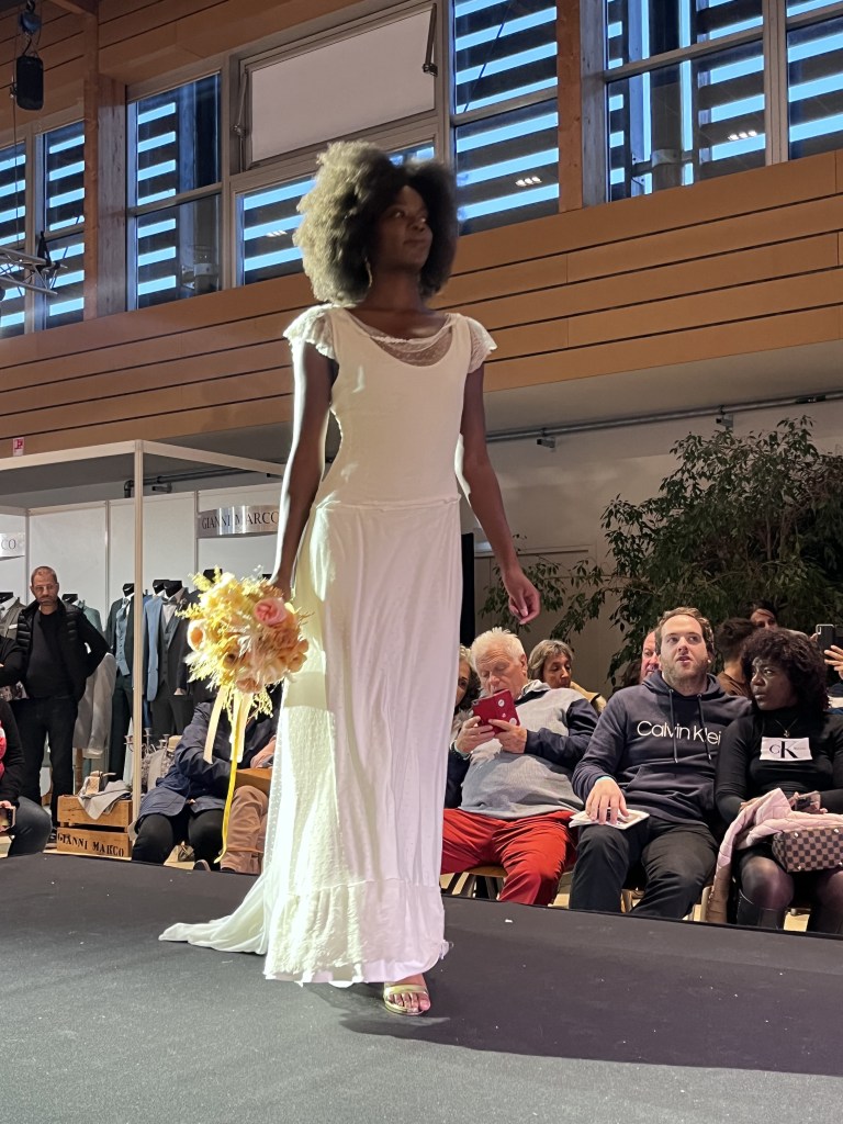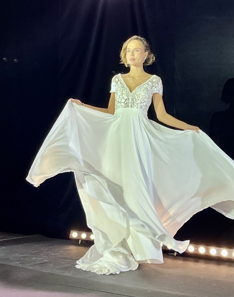 Nuestro equipo agradece y aplaude calurosamente a Maurane, una de las modelos femeninas, que, gracias a su profesionalidad, voló literalmente por el escenario, con sus voluptuosos movimientos que resaltaban sus espléndidos trajes de novia.